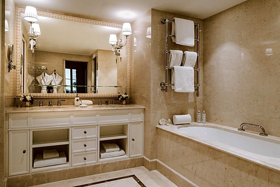 This brightly lit suite has a large bedroom, a living room and a dressing room. The marble bathroom features a bathtub, a separate shower and a double sink. Possible request of balcony with view on the Eiffel tower (upon availability) with a supplement (100euros per night).