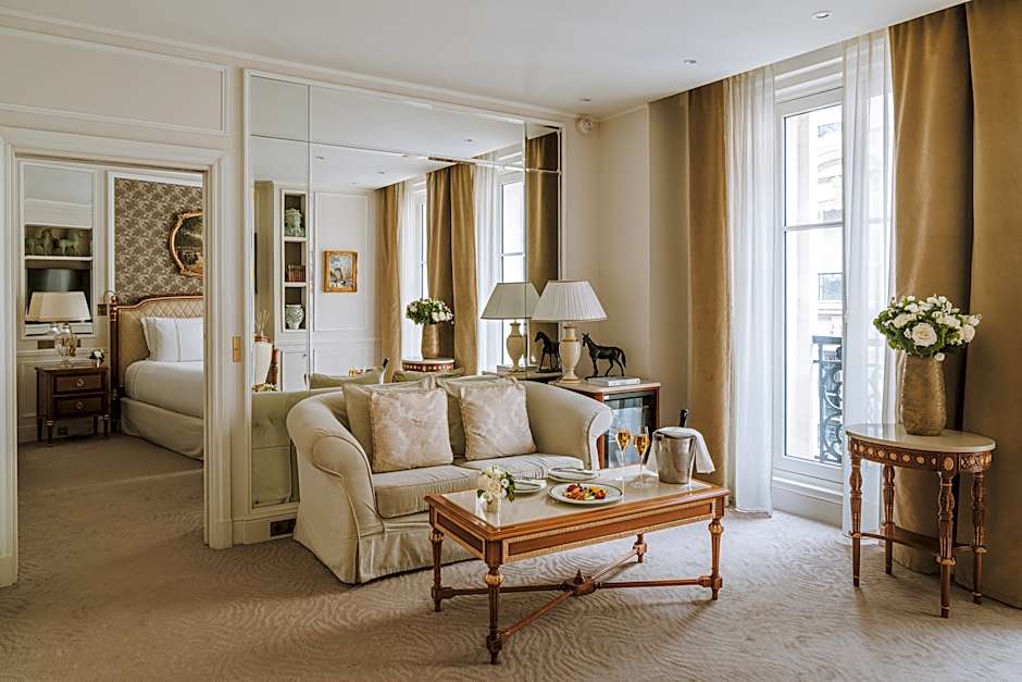This brightly lit suite has a large bedroom, a living room and a dressing room. The marble bathroom features a bathtub, a separate shower and a double sink. Possible request of balcony with view on the Eiffel tower (upon availability) with a supplement (100euros per night).
